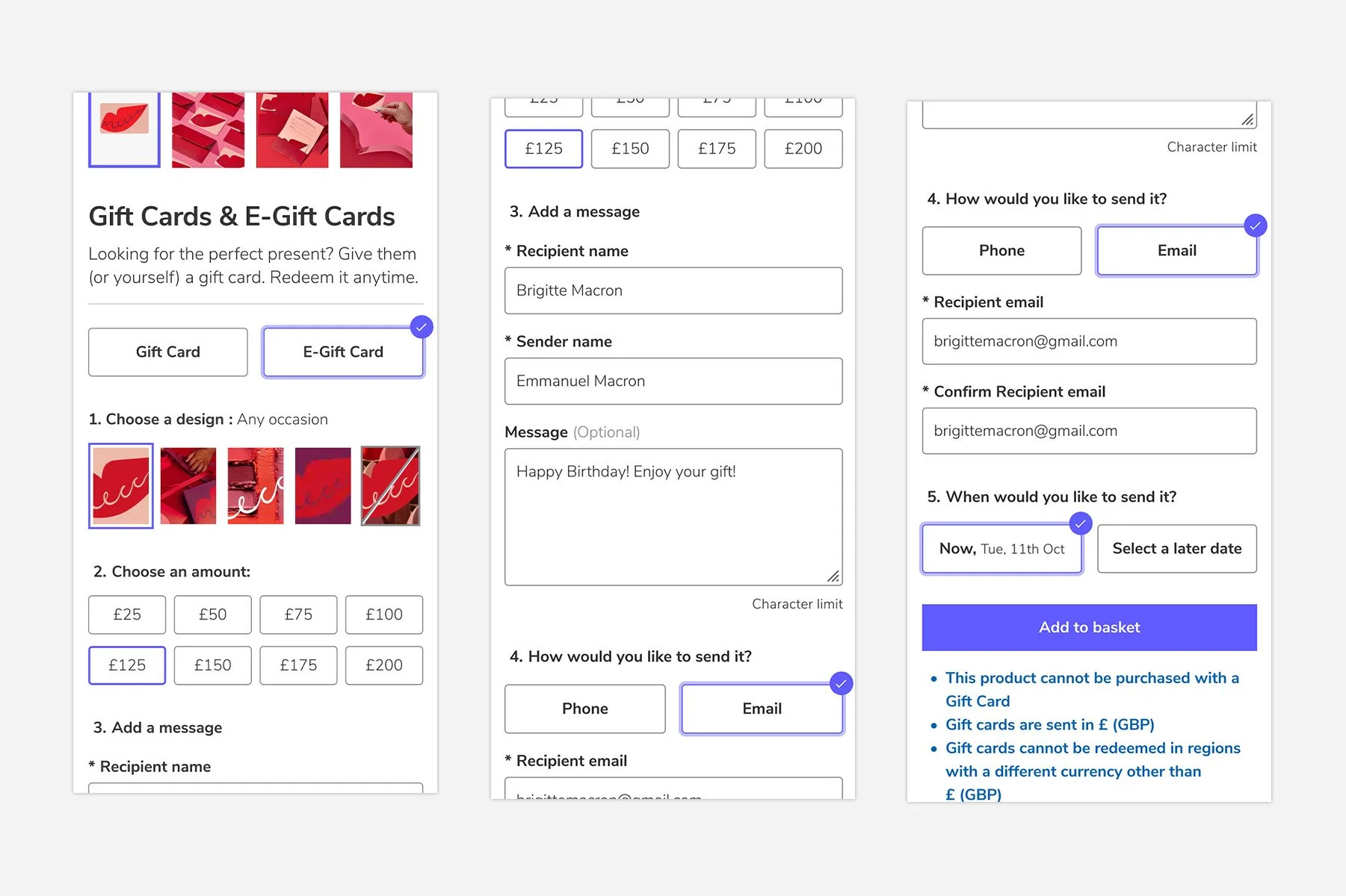 Leveraging a previous solution design I had created that allowed sites to support multiple Product Page Templates, and the work delivered for Flexible Fulfilment, I was able to design a technically efficient, business and user-configurable Gift Card product fully supported on all storefronts for all markets as well as in our OMS and Fraud Engine and managed the UX design and development of the feature to bring the POC to testing.